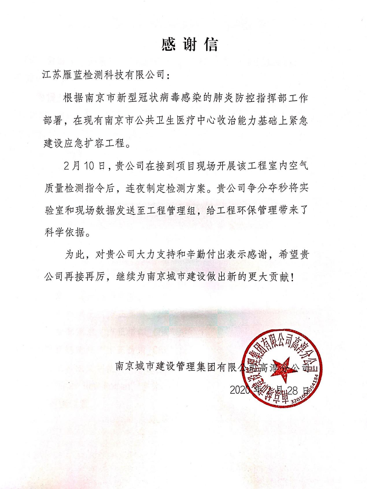 面對突發(fā)的新冠疫情,根據(jù)市疫情防控指揮部部署,在南京新冠肺炎收治點緊急擴建南京版“火神山”,并委派江蘇雁藍馳援該工程的環(huán)境檢測工作。接到指令后,我公司6小時內(nèi)組建完成專項工作組并完成檢測方案上報,技術(shù)人員在一線連續(xù)奮戰(zhàn)4個晝夜完成全部檢測工作,為指揮部提供全面的檢測數(shù)據(jù)和分析結(jié)果。