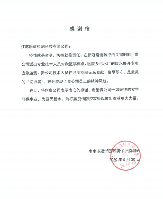 在疫情期間,受建鄴、雨花、江北等環(huán)保部門委托,我公司負責對各區(qū)隔離點、醫(yī)院及污水廠的廢水展開專項應(yīng)急監(jiān)測。在克服防護物資緊缺、人員調(diào)配困難的情況下深入一線保質(zhì)保量完成檢測工作,為管理部門提供1000余份檢測數(shù)據(jù)。